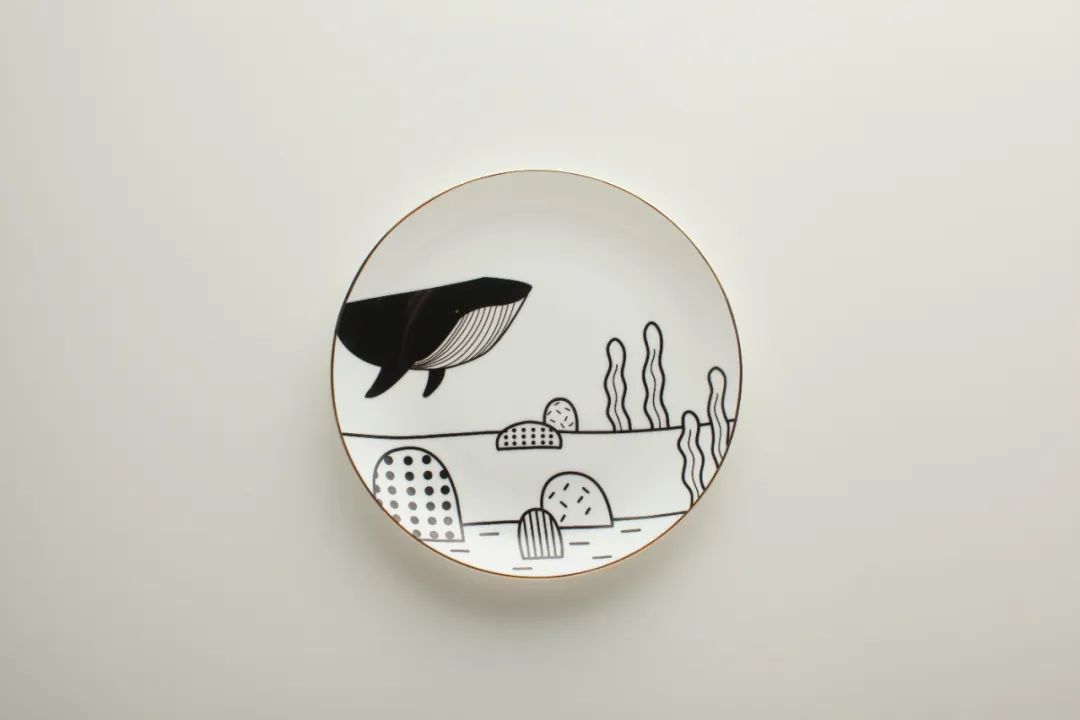 (设计师给餐盘里绘制了一头鲸鱼,麻麻们可以在盘子里放上海的味道的食物)